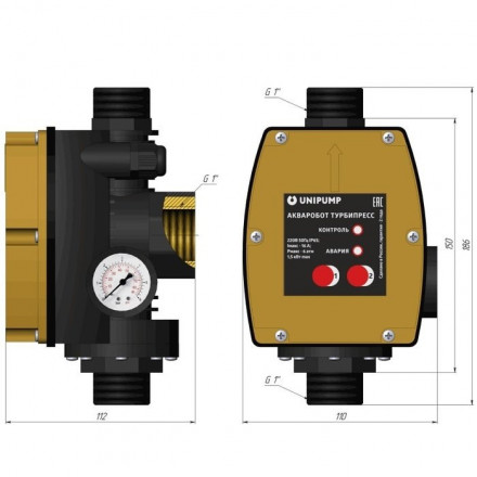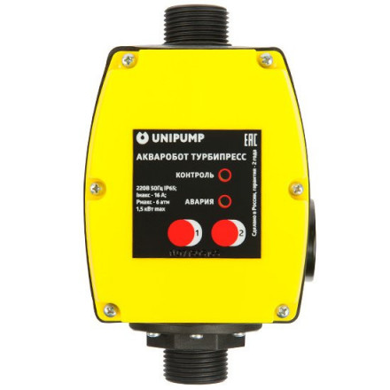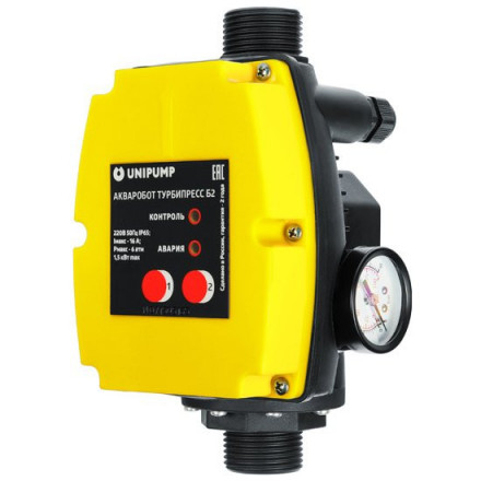 Unipump (Юнипамп) ТУРБИПРЕСС Б2 представляет собой блок автоматического управления двумя насосами, включенными параллельно. Прибор позволяет поддерживать в системе водоснабжения давление в пределах от 0,5 до 5 бар. Кроме того, оборудование способно автоматически задавать режим работы секций (попеременный либо совместный), что способствует значительной экономии ресурса электрических насосов. Данный блок автоматически отключает насосы при повышении давления в системе выше 5,5-7 атм, а также в случае полного отсутствия воды в системе водоснабжения, что предупреждает “сухой ход”. Прибор может работать совместно с насосами, максимальная производительность которых составляет 120 л/мин.
