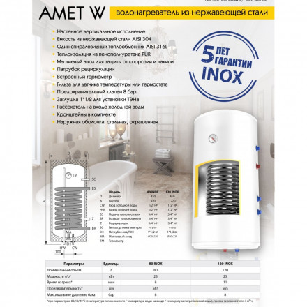 Бойлер Termica AMET 120 INOX является водонагревателем для приготовления горячей воды в бытовых целях, а по способу нагрева классифицируется - косвенного нагрева. Бойлер косвенного нагрева Termica AMET по типу установки - напольный с нержавеющим баком и теплообменником на 120 литров. Водонагреватели Termica созданы в соответствии с последними европейскими стандартами, в бойлере применены современные технологии лазерной сварки швов внутренней поверхности бака. Высокая производительность водонагревателя обеспечивается за счет повышенной поверхности внутреннего теплообменника. Недорогой бойлер Termica Amet 120 превосходит по своим показателям качества многих конкурентов благодаря внутренней ёмкости выполненной из высококачественной нержавеющей стали. Дополнительная возможность установки ТЭНа позволяет использовать бойлер без теплогенератора (котла) максимально комфортно в летний период года.