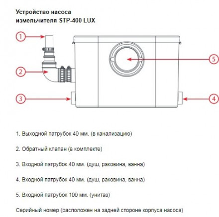 Туалетный насос Jemix STP-400 LUX - с измельчителем, поэтому его можно подсоединять к унитазу. Для этого подключения он имеет входной патрубок диаметром 4" (100 мм). Унитаз должен иметь горизонтальный выход. Также у насоса STP-400 есть еще два дополнительных патрубка на вход диаметром 1,5" (40 мм) каждый. К ним можно подвести слив от умывальника, раковины, душа или ванной, т.е. от одного или совместно двух сантехприборов.