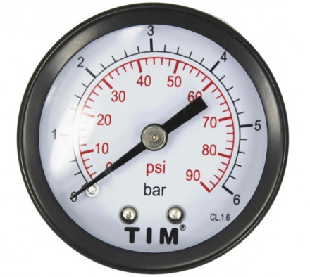 Манометр аксиальный TIM, корпус 50 мм, диапазон 0-6 бар, подключение 1/4" (артикул Y-50T-6) используется для измерения давления в системах отопления и водоснабжения.