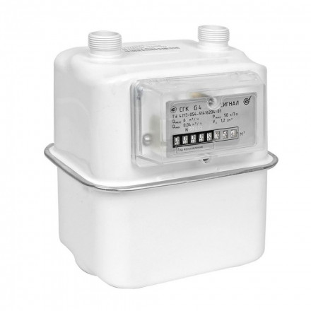 Счетчики газа Сигнал СГК-G4 с резьбой 1 дюйм купить в розницу или оптом по низким ценам вы можете в нашем интернет-магазине. Газовый счетчик СГК-G4 Сигнал с верхним подводом и монтажным межосевым расстоянием между штуцерами 110 миллиметров. Движение газа в СГК-G4 диафрагменного типа левое и соответствует ходу газовой среды слева направо или левостороннему исполнению. Мы организуем доставку по Нижнему Новгороду и Нижегородской области, отправляем счетчики учета газа по всей России. На все газовое оборудование имеются паспорт производителя и сертификат соответствия и качества.