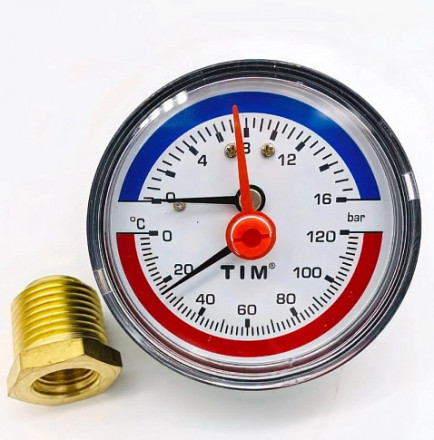Термоманометр аксиальный - измерительный прибор, предназначенный для показа текущих показаний давления и температуры в бытовых гидравлических системах (отопления и водоснабжения). Для снятия показаний предусмотрены две шкалы - давления и температуры. Комплектуется автоматическим запорным клапаном, позволяющим демонтировать термоманометр без слива системы.