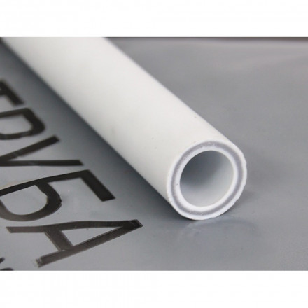 Труба армированная стекловолокном РосТурПласт 20*3.4 мм PN25 (PPR/PPR - GF/PPR), где внутренний и наружный слои сделаны из полипропилена (PPR-100), а средний слой выполнен из PPR со стекловолокном (PPR - GF). Стенка трехслойной трубы изготовлена в одинаковой пропорции всех слоев и каждый слой равен одной трети от общей толщины стенки.