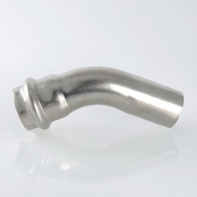 (VTi.958.I) Однораструбный пресс-угольник 45° из нержавеющей стали обеспечивает соединение тонкостенных стальных труб систем водоснабжения, отопления, иных инженерных и технологических установок с рабочей температурой до 95 °С и давлением до 16 бар. Изделие изготовлено из стали AISI 304. Материал уплотнения – эластомер EPDM Sh70. Благодаря бесштуцерной конструкции соединитель обладает малым коэффициентом местного сопротивления – сужение канала практически отсутствует. Фитинг рассчитан на обжатие с помощью пресс-инструмента V-профиля.