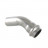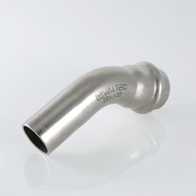 (VTi.958.I) Однораструбный пресс-угольник 45° из нержавеющей стали обеспечивает соединение тонкостенных стальных труб систем водоснабжения, отопления, иных инженерных и технологических установок с рабочей температурой до 95 °С и давлением до 16 бар. Изделие изготовлено из стали AISI 304. Материал уплотнения – эластомер EPDM Sh70. Благодаря бесштуцерной конструкции соединитель обладает малым коэффициентом местного сопротивления – сужение канала практически отсутствует. Фитинг рассчитан на обжатие с помощью пресс-инструмента V-профиля.