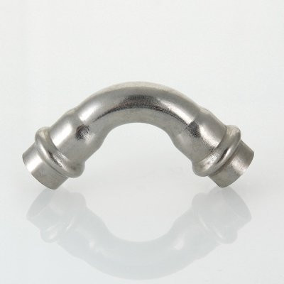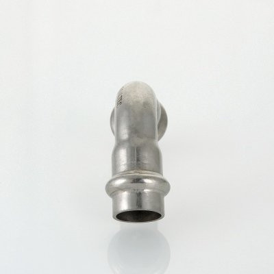 (VTi.951.I) Двухраструбный пресс-угольник из нержавеющей стали обеспечивает соединение тонкостенных стальных труб систем водоснабжения, отопления, иных инженерных и технологических установок с рабочей температурой до 95 °С и давлением до 16 бар. Изделие изготовлено из стали AISI 304. Материал уплотнительных колец – эластомер EPDM Sh70. Фитинг VTi.903.l – угольник для соединения труб под углом 90°. Благодаря бесштуцерной конструкции соединитель обладает малым коэффициентом местного сопротивления – сужение канала практически отсутствует. Фитинг рассчитан на обжатие с помощью пресс-инструмента V-профиля.